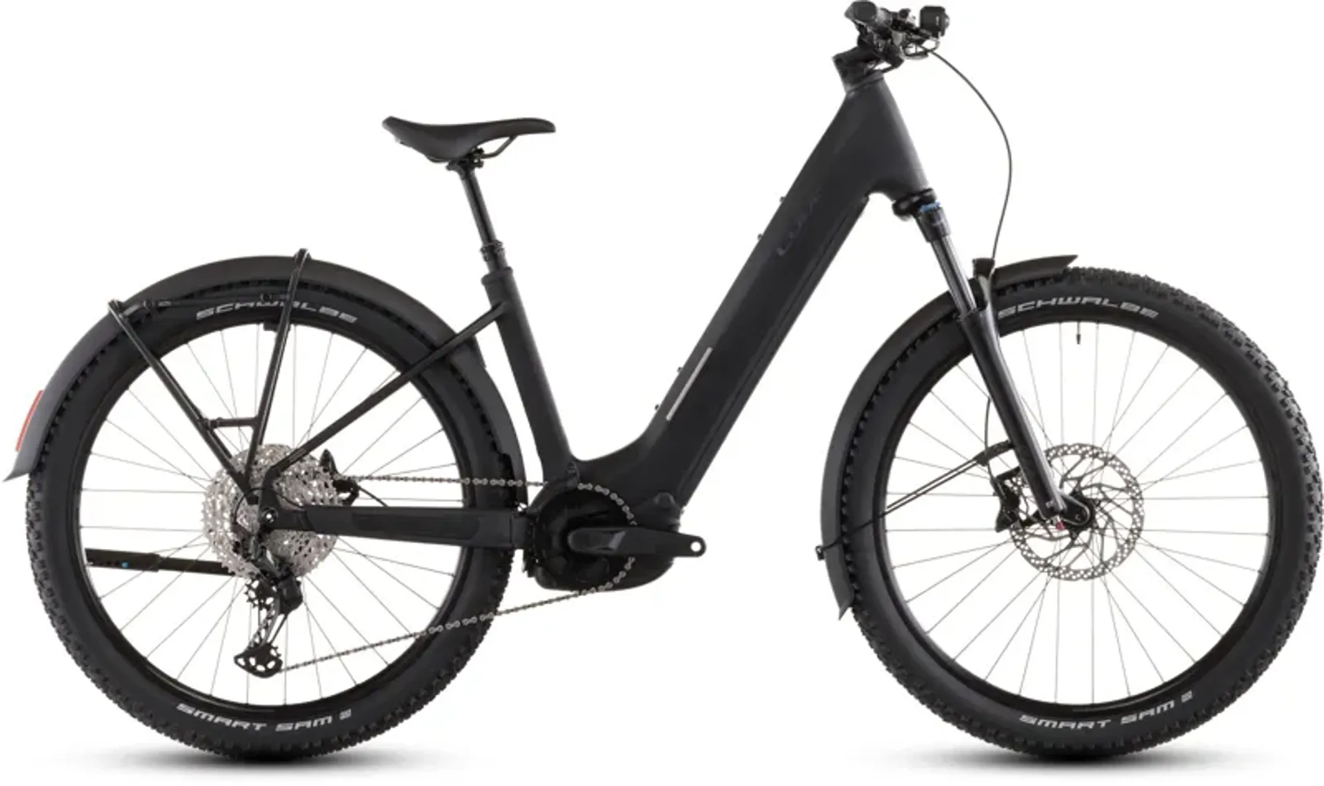 The Reaction Hybrid Pro FE combines the versatility of a fully equipped tourer and the ruggedness of a mountain bike, with added Bosch power. The mudguards, luggage carrier, kickstand, and lights are just the start. You can also tackle any route, off-road or on, with ease thanks to an 800Wh battery and powerful Bosch CX drive. Combined with Shimano's easy-to-use XT 12-speed gears, it's all you need to comfortably ride any hill. For coming back down the other side, strong Shimano 4-piston hydraulic disc brakes and grippy Schwalbe 6.6cm (2.6") tyres are fitted. There's also an air-sprung fork with 120mm of travel (100mm for small frame sizes and for all Easy Entry models), and a remote dropper seatpost for extra comfort and control on rougher trails.