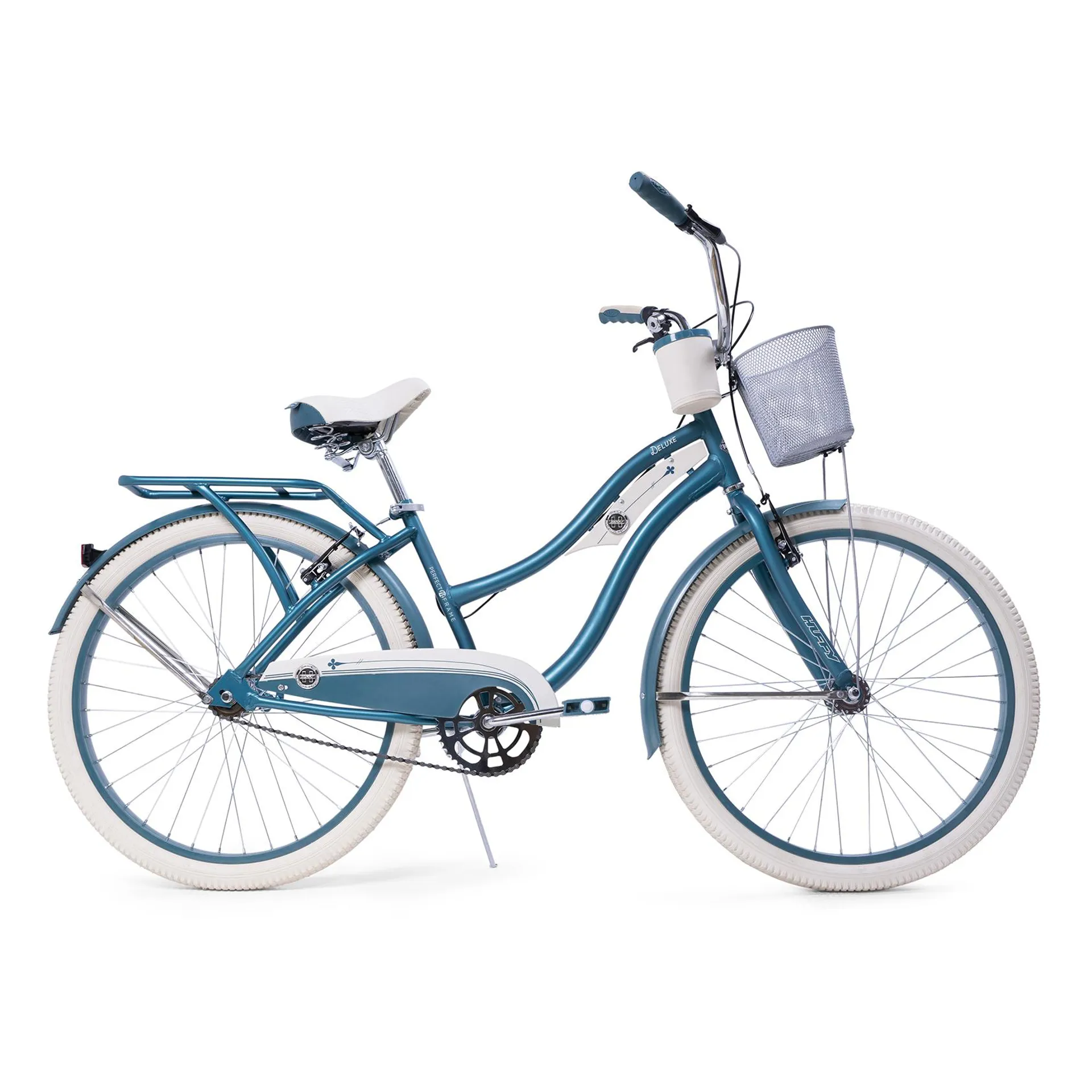 cruise in style onboard this classic emerald green cruiser. Packed with comfort features and designed with style, the deluxe is ready make you fall in love with cycling all over again. The exclusive perfect fit frame supports your natural riding position, which benefits your back, arms, and hands. The deluxe padded spring saddle, dual density grips and pedals, and wider tyres deliver maximum comfort no matter how long you ride. Fenders keep the dirt and water away and add to the classic cruiser style, and the front and rear alloy v-brakes keep you in complete control.