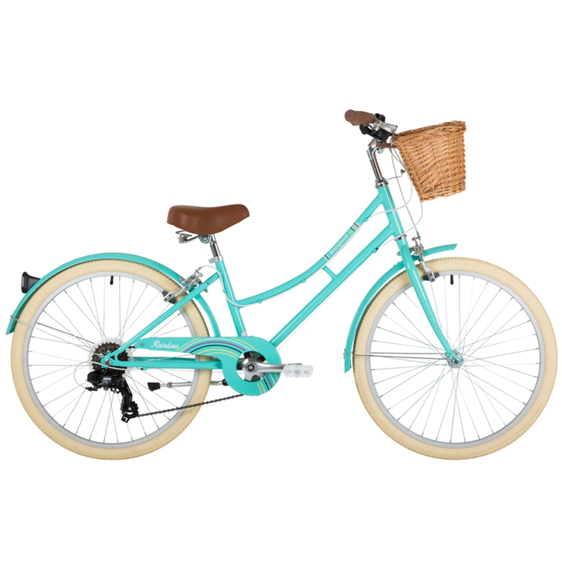 Up front the Bridgford Rainbow comes with a full wicker basket and attached to the bike via brown leather straps, ideal for carrying books, helping Mum with the shopping or going for those weekend family picnics! In addition, the bike comes with full colour-coordinated front and rear mudguards to divert the spray away for a cleaner riding experience. The rear mudguard features an integrated reflector for added safety.