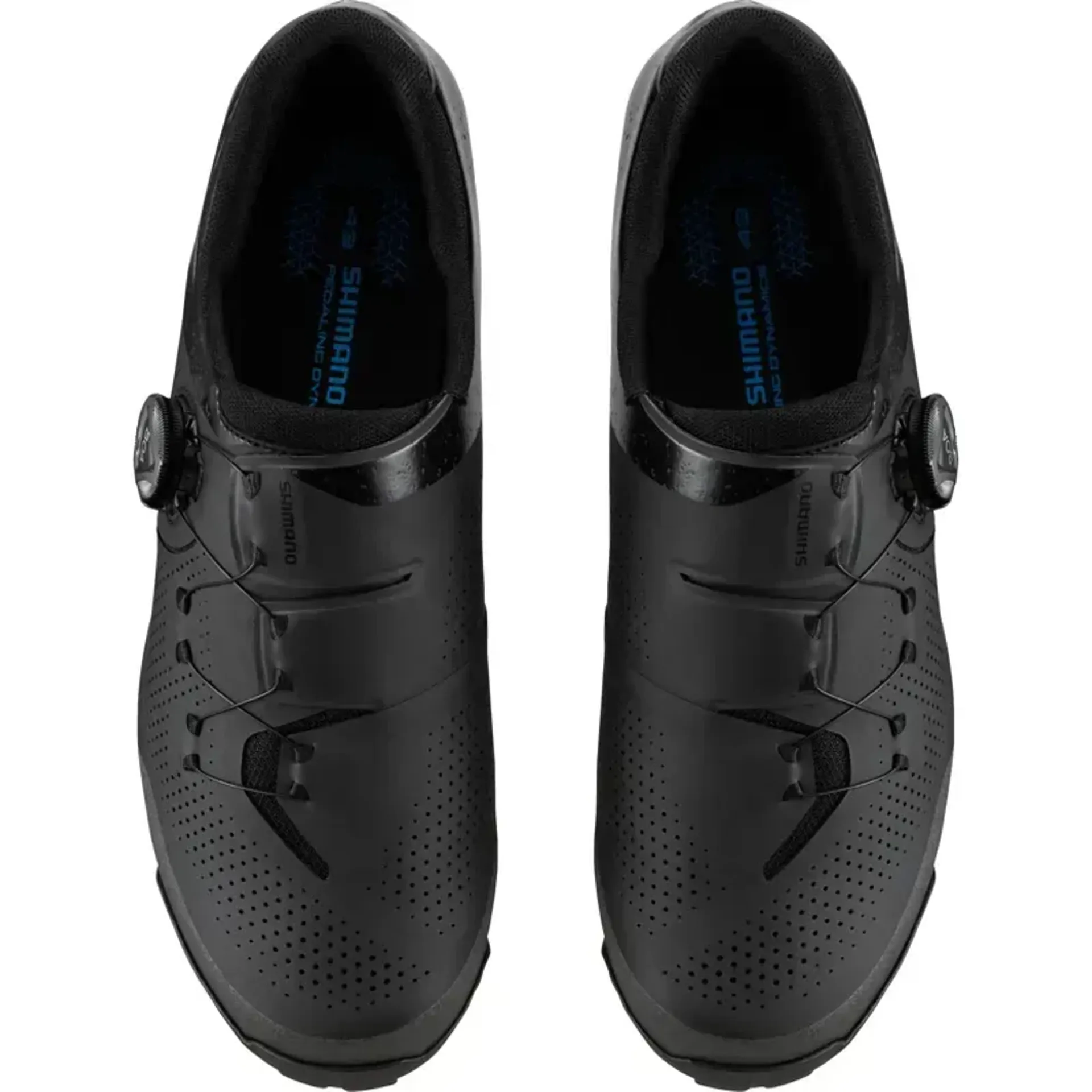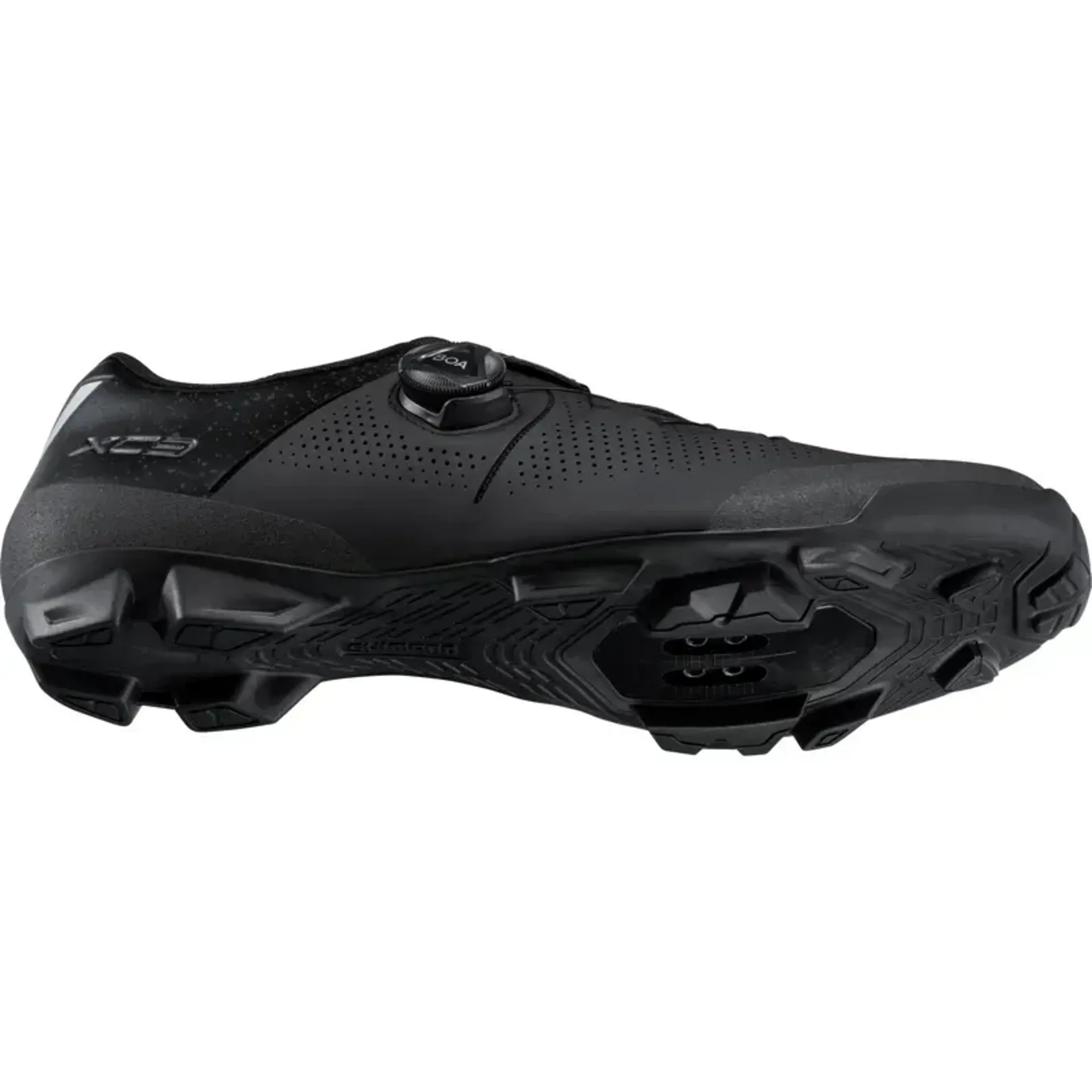 These shoes feature a fit-engineered lacing pattern and BOA® Fit System for balanced forefoot comfort. An integrated seamless midsole and upper provide superior fit and stability. The shoes include a 26% recycled mesh upper and midsole (by weight). A rubber XC racing outsole is designed for stable pedaling and secure walking grip. A lightweight glass fiber reinforced nylon sole ensures power transfer. The low stack height midsole stabilizes the foot and optimizes power transfer. A surround-wrapping upper structure reduces overlap and provides a glove-like fit. The perforated synthetic leather composite upper improves fit and breathability.